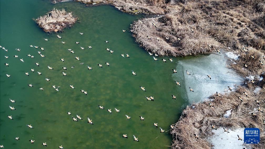 候鳥在黃河寧夏段一處濕地棲息、覓食(無人機照片,2月26日攝)。