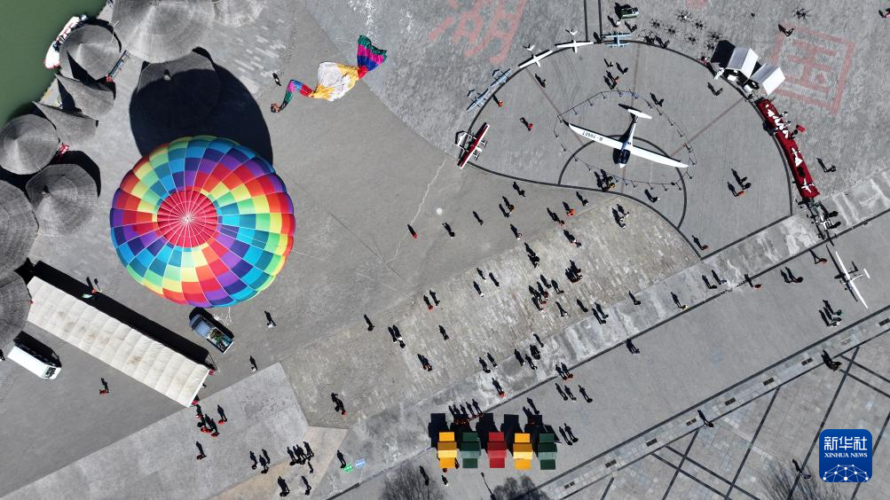 3月29日,游客在沙湖景區參觀低空經濟航模展(無人機照片)。