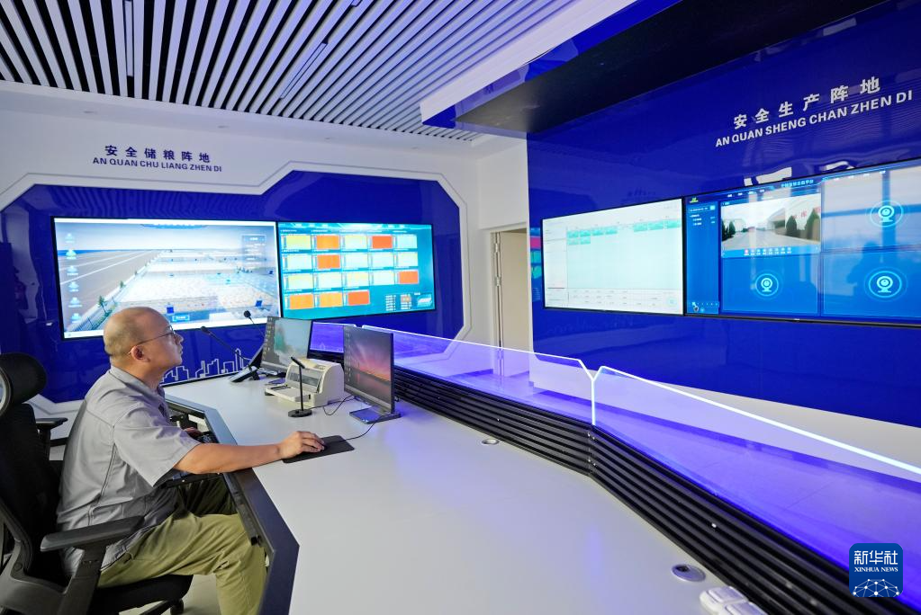 7月16日,寧夏糧食集團銀川濱河儲備庫工作人員在智慧化控制室對收儲糧食進行全程智能監控。