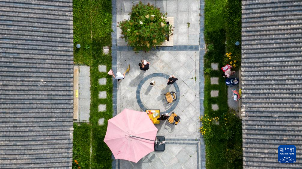 7月19日,游客在寧夏固原市涇源縣香水鎮新月村香水風情堡民宿旅游區休閑(無人機照片)。