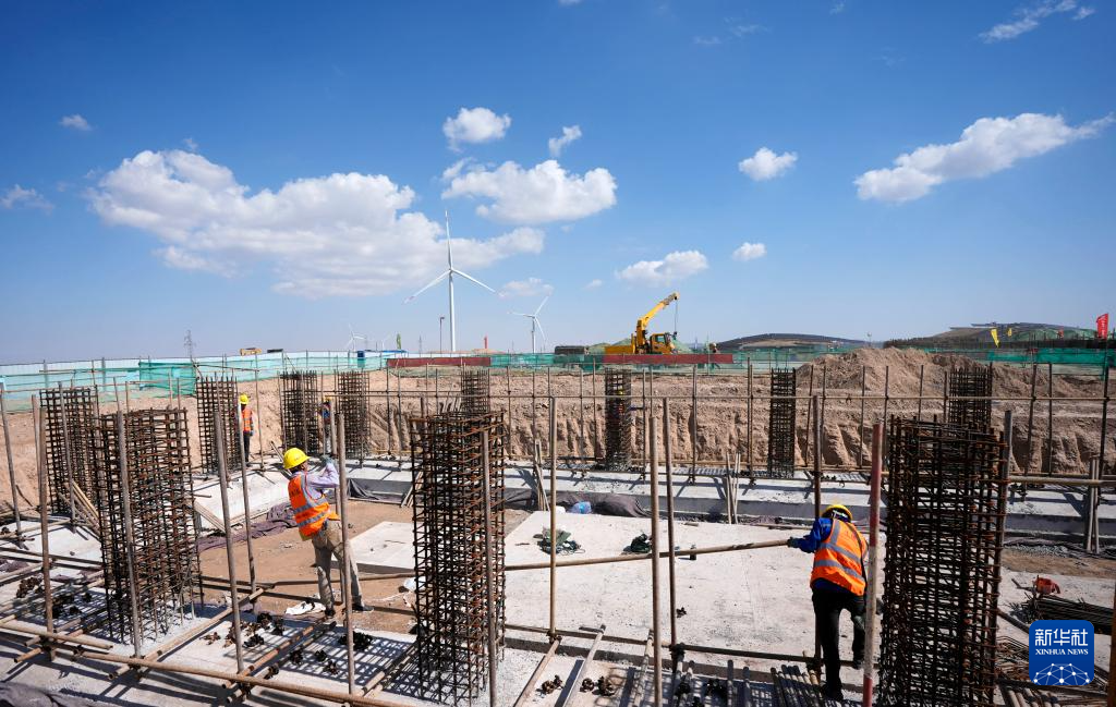 7月21日拍攝的中衛300萬千瓦光伏綠電項目2號330千伏變電站建設現場(無人機照片)。