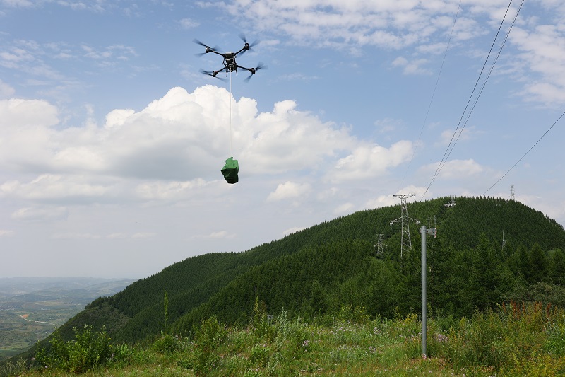 “嗡嗡嗡”……隨著工作人員操作遙控器,一架擁有強力旋翼的載重無人機抵達山頭指定位置,將下方吊掛的80斤重的設備工具包精準釋放。