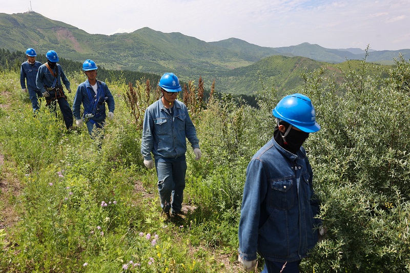固原供電公司帶電作業人員輕裝上山,準備開展作業。劉輝 攝