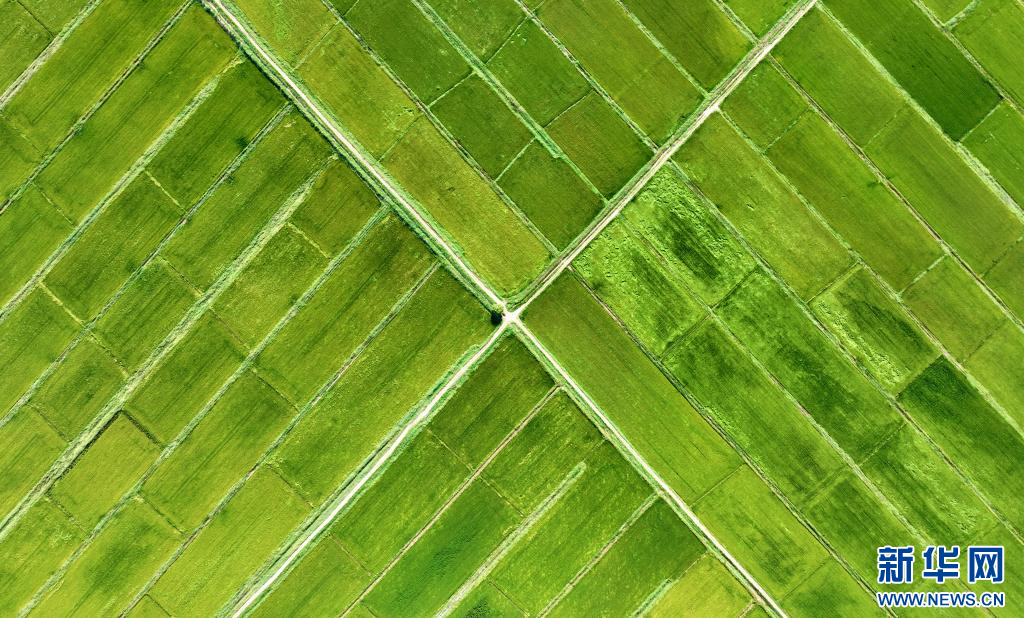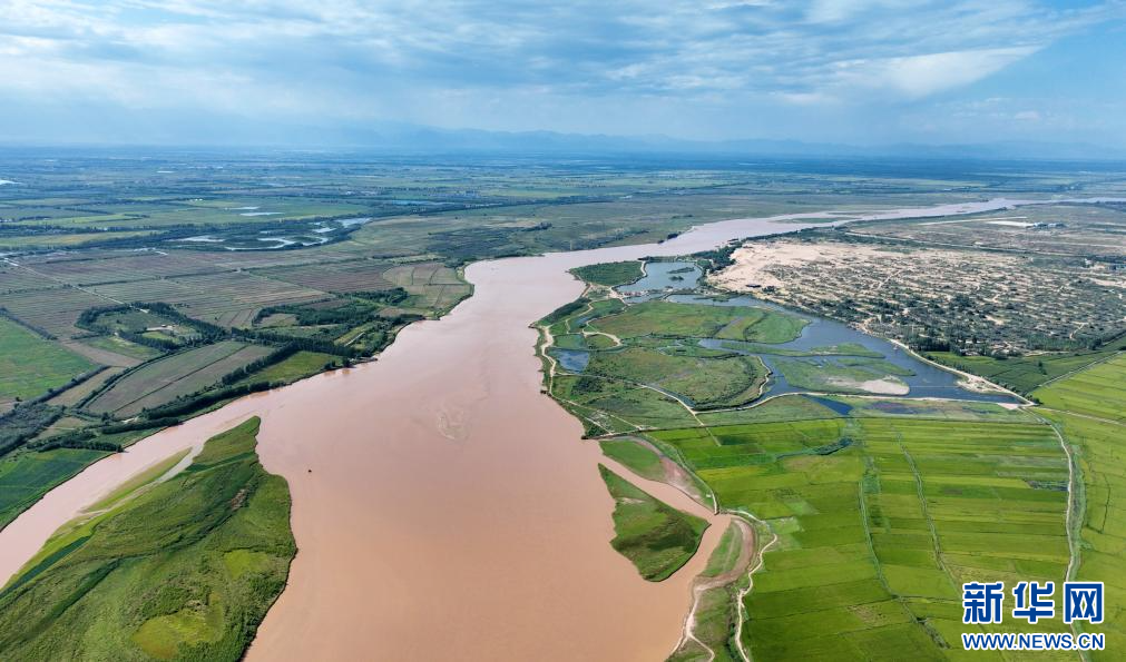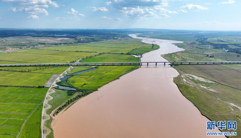 在黃河銀川段,兩岸農田與蜿蜒黃河、道路及橋梁互相映襯,構成一幅“塞上江南”生態美景。