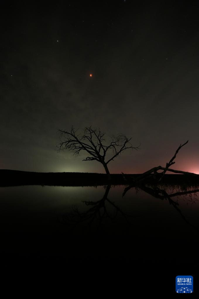 北京時間9月7日午夜至8日凌晨,全球多地天宇上演壯觀的月全食現象。月全食的原理是月、地、日運行至一條直線時,月球進入地球的本影,太陽投射在月球上的光完全被地球擋住。由于地球大氣層對太陽光有折射和散射作用,其中波長最長的紅光落在月面上最多,因而出現“紅月亮”。新華社記者 王鵬 攝