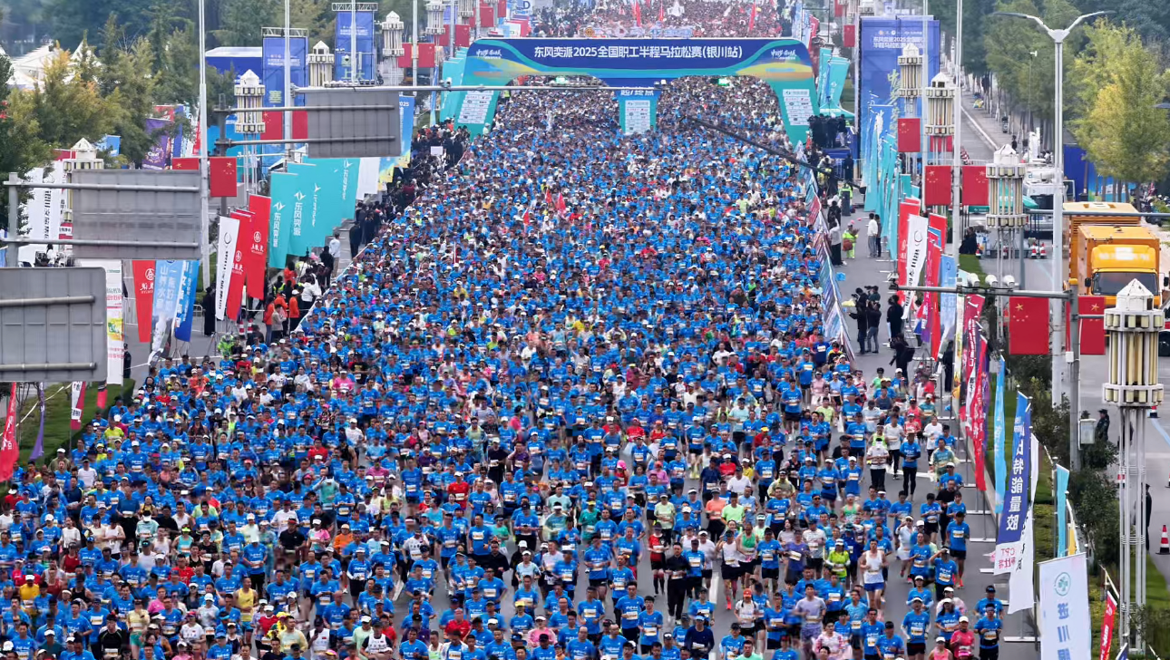 據悉,2025全國職工半程馬拉松賽是全國首個成功通過中國田徑協會A1類賽事認證的職工路跑賽事,首次落戶銀川。賽事設半程馬拉松、特色方陣領先跑、健康跑三個組別,其中,特色方陣領先跑項目由勞模工匠、百年工運、產業建功和新就業形態勞動者四個方陣組成,大家脫下工裝換賽服,用激情奔跑的身影,繪就了一幅動感活力的秋日畫卷,展現了新時代職工昂揚向上的精神風貌。