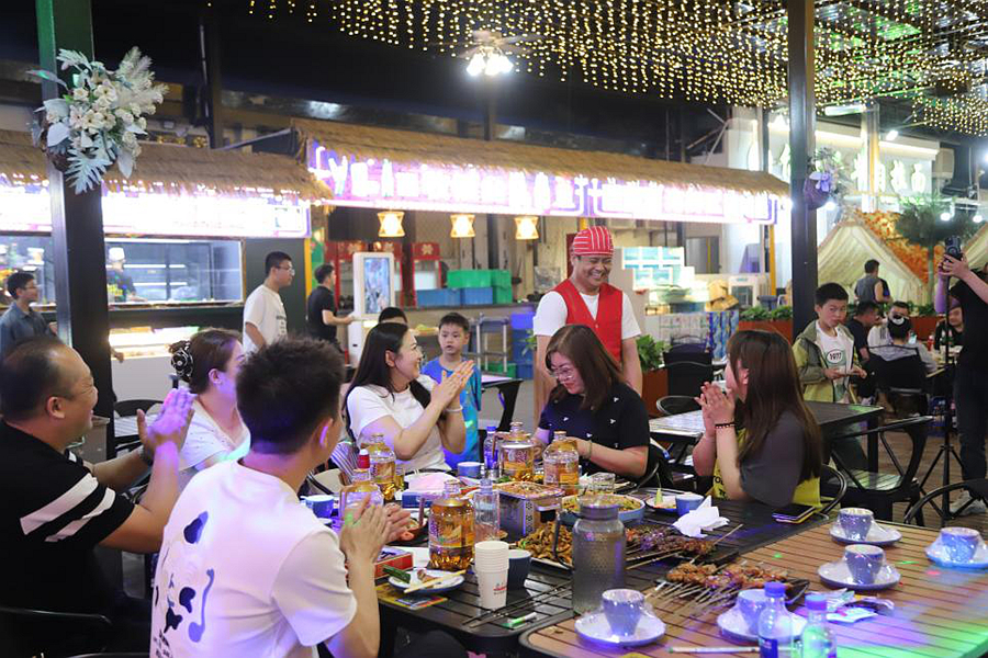 萬達文旅小鎮烤串的滋滋聲、八寶茶的甜香,以及廣場文藝演出、互動游戲,與游客的歡笑聲共同奏響熱烈交響曲;夜幕降臨后,璀璨燈光秀更是吸睛無數。