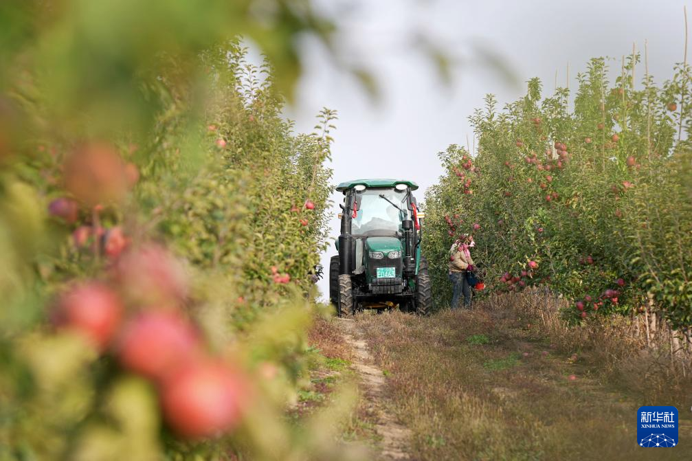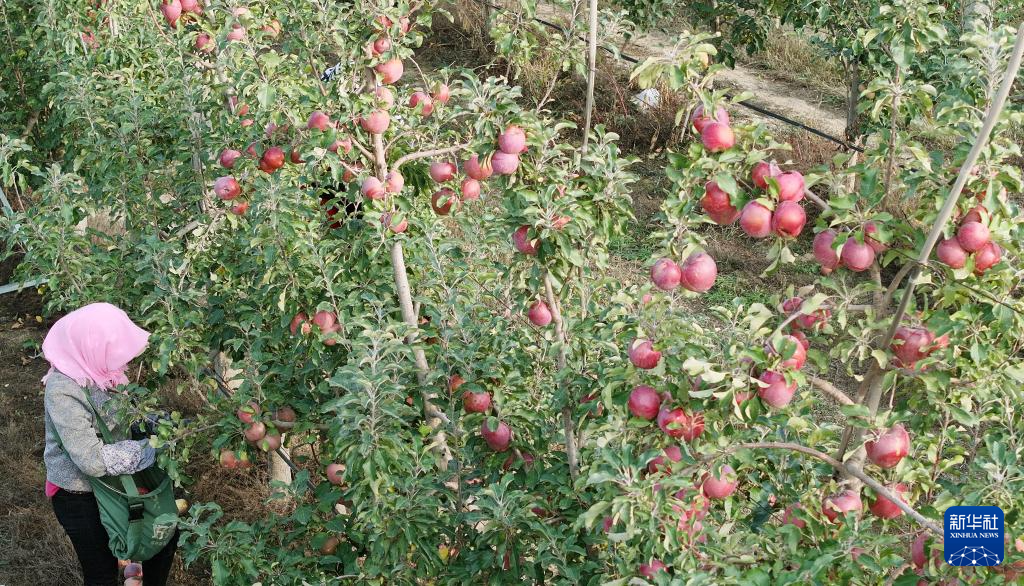 農戶在中衛市沙坡頭區“旱蘋果”種植基地采摘蘋果(10月25日攝)。